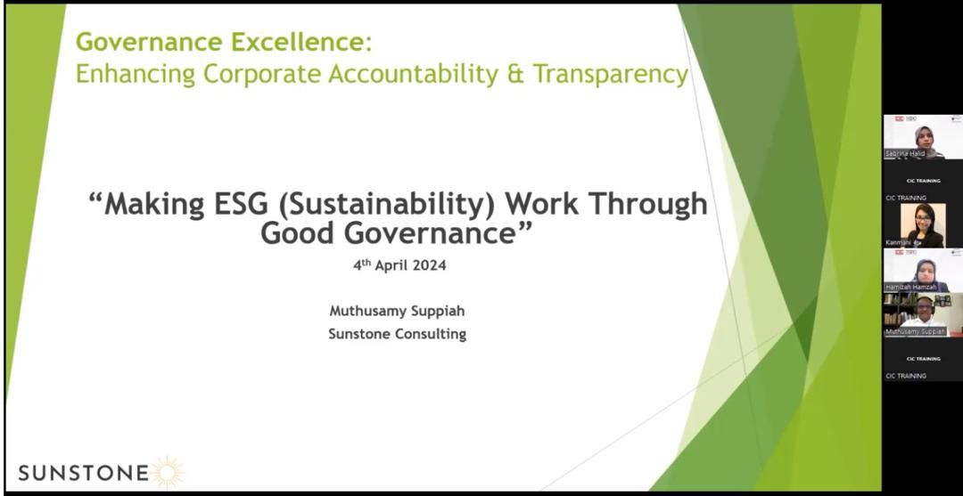 “Governance Excellence: Enhancing Corporate Accountability and Transparency” was the third instalment of the ESG webinar series by CIC Capital Consultancy, in collaboration with the Malaysia Productivity Corporation (MPC) and supported by Universiti Malaya. Held on 4 April 2024, this free session focused on the importance of strong governance in driving ethical, transparent, and sustainable business practices.